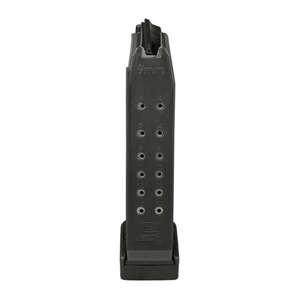 MAGAZIN G19+2 17 SCHUSS | 9MM LUGERDieses GLOCK Magazin besteht aus einem gehärteten Stahleinsatz, der von einem High-Tech-Polymer ummantelt ist, um das Magazin zu schützen und eine Verformung zu verhindern, selbst wenn es aus grosser Höhe fallen gelassen wird. Die hochwertige Feder und der Follower gewährleisten eine zuverlässige Zuführung von der ersten Patrone, die durch eine vollständig komprimierte Feder zugeführt wird, bis hin zum letzten Schuss. Der doppelt geschnittene Magazinkörper funktioniert auch mit einem umgekehrten Magazinverschluss bei Gen4 und Gen5 GLOCK Pistolenmodellen.