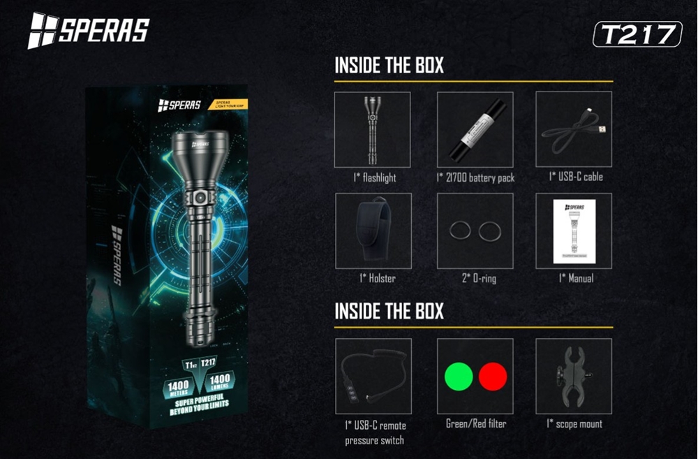 Der SPERAS T217-V2 ist die aktualisierte Version des T217, eines der besten LED-Taschenlampen in Bezug auf die Strahlungsentfernung mit Luminus SFT40 2.0, fortschrittlichem Strukturdesign und Treiberentwurf. Die Taschenlampe kann eine maximale Leistung von 2000 lm und eine maximale Strahlungsweite von 1400 m erreichen, was Ihnen einen leistungsstarken Fokussierungsstrahl bietet, um die Ziele besser zu treffen; Der Multifunktions-Typ-C-Anschluss unterstützt Typ-C-Ladung und Typ-C-Ferndruckschalter für eine einfachere und effektivere Nutzung. Das neue Kamerafilterdesign hilft Jägern, den Rot/Grün-Strahl beim Jagen zu erhalten.