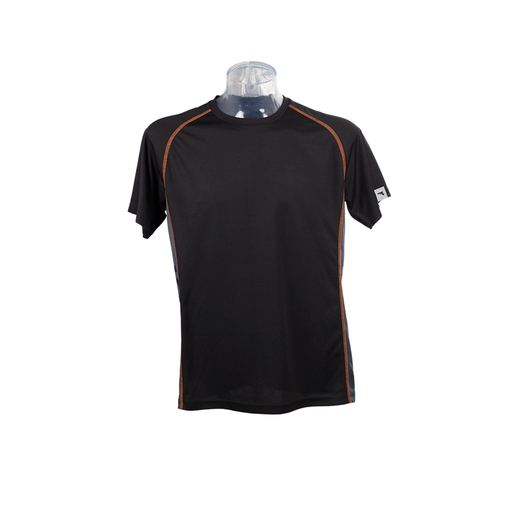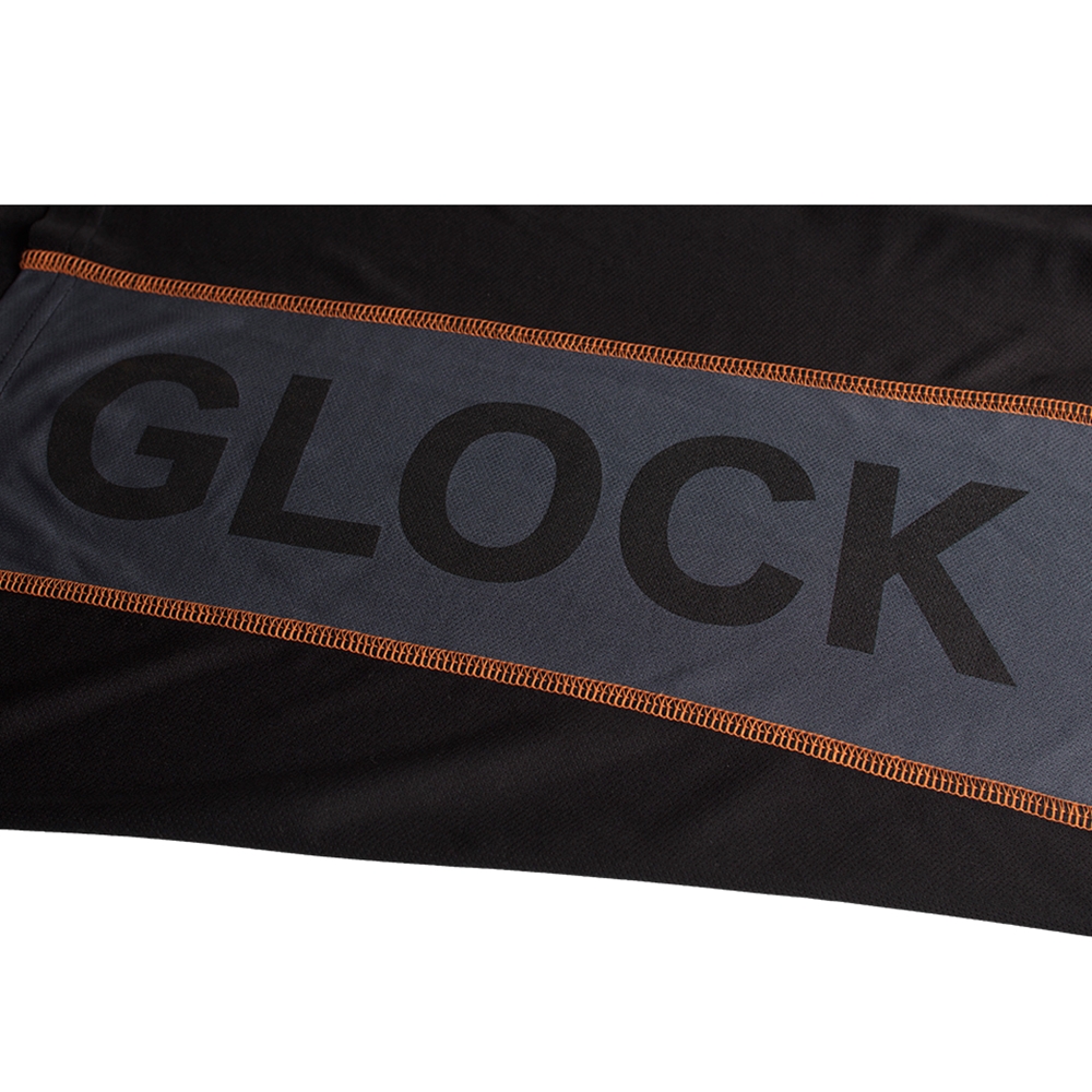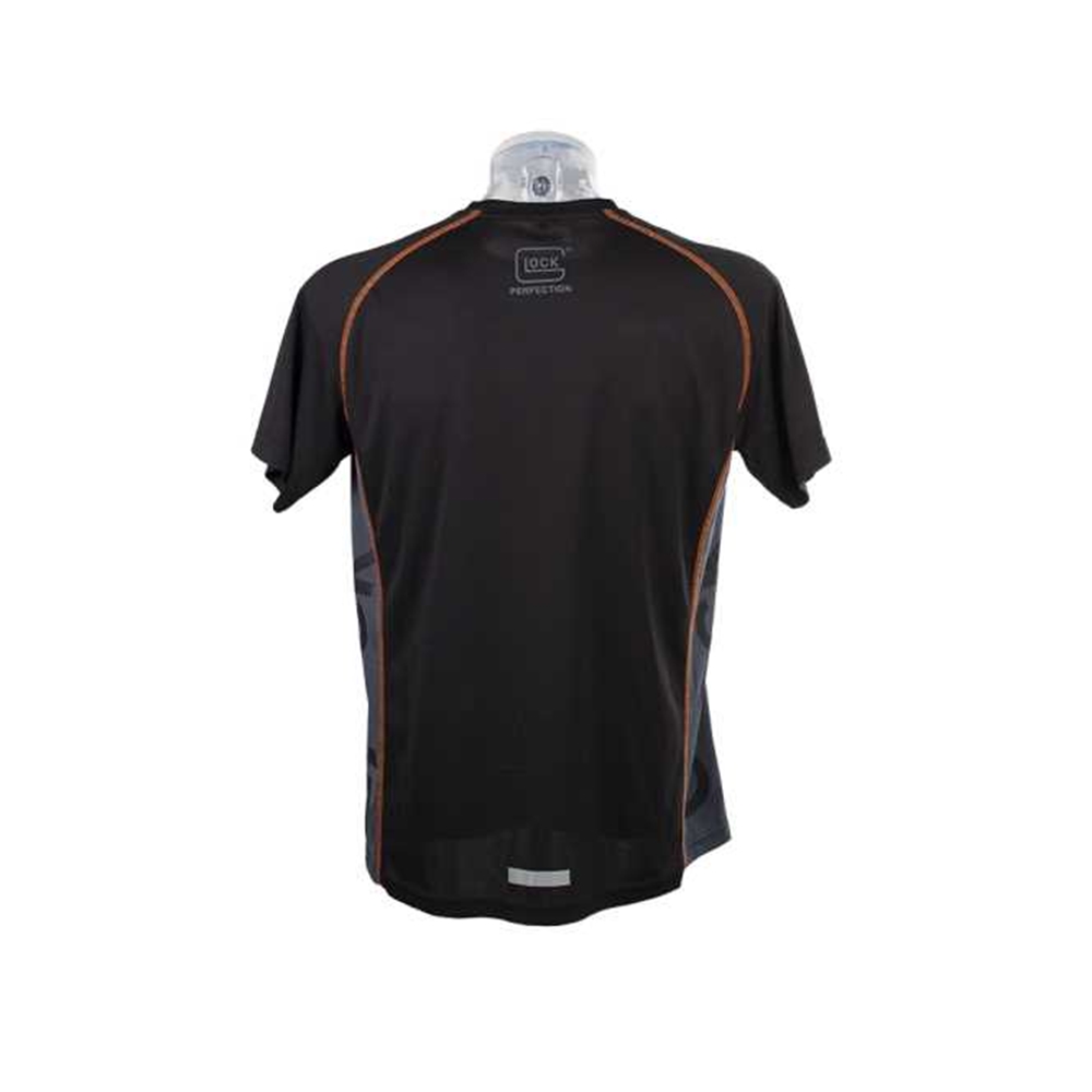 Schwarzes Funktionsshirts. Auf der Rückseite mit Glock Perfection Logo und auf der Seite ebenfalls mit Glock Logo auf grauem Hintergrund.