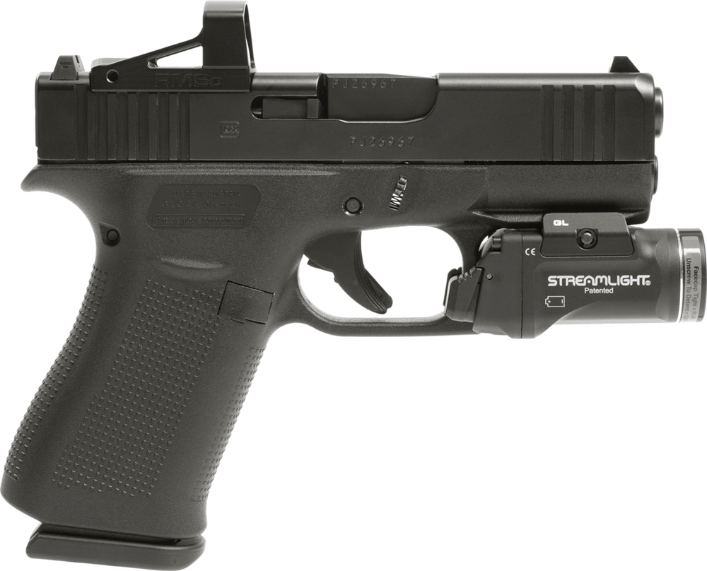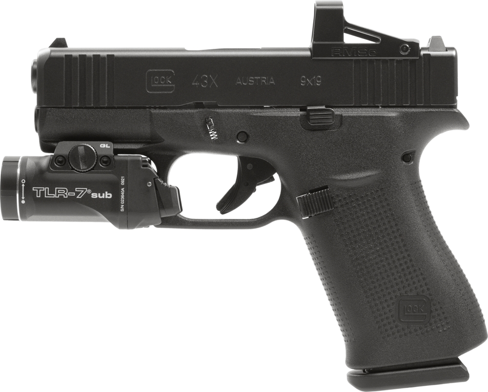 G43X - Le nouveau pistolet slimline GLOCK sub-compact en configuration MOS avec viseur point rouge RMSc Le G43X MOS est disponible en combinaison avec un Streamlight TLR-7® Sub et un Shield RMSc. Le nouveau modèle slimline G43X MOS combine deux caractéristiques GLOCK bien connues. En combinaison avec le Streamlight TLR-7® Sub et le Shield RMSc, le design élancé et le système optique modulaire font de ce pistolet le partenaire tactique parfait.